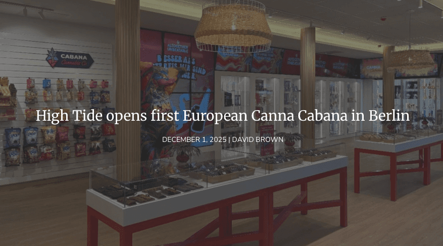 High Tide Inc. announced on Monday, December 1, 2025, the opening of its first international Canna Cabana retail store, located in Berlin, Germany. This marks the brand’s formal brick-and-mortar entry into both Europe and the German market, with a focus on cannabis accessories and consumer lifestyle goods.